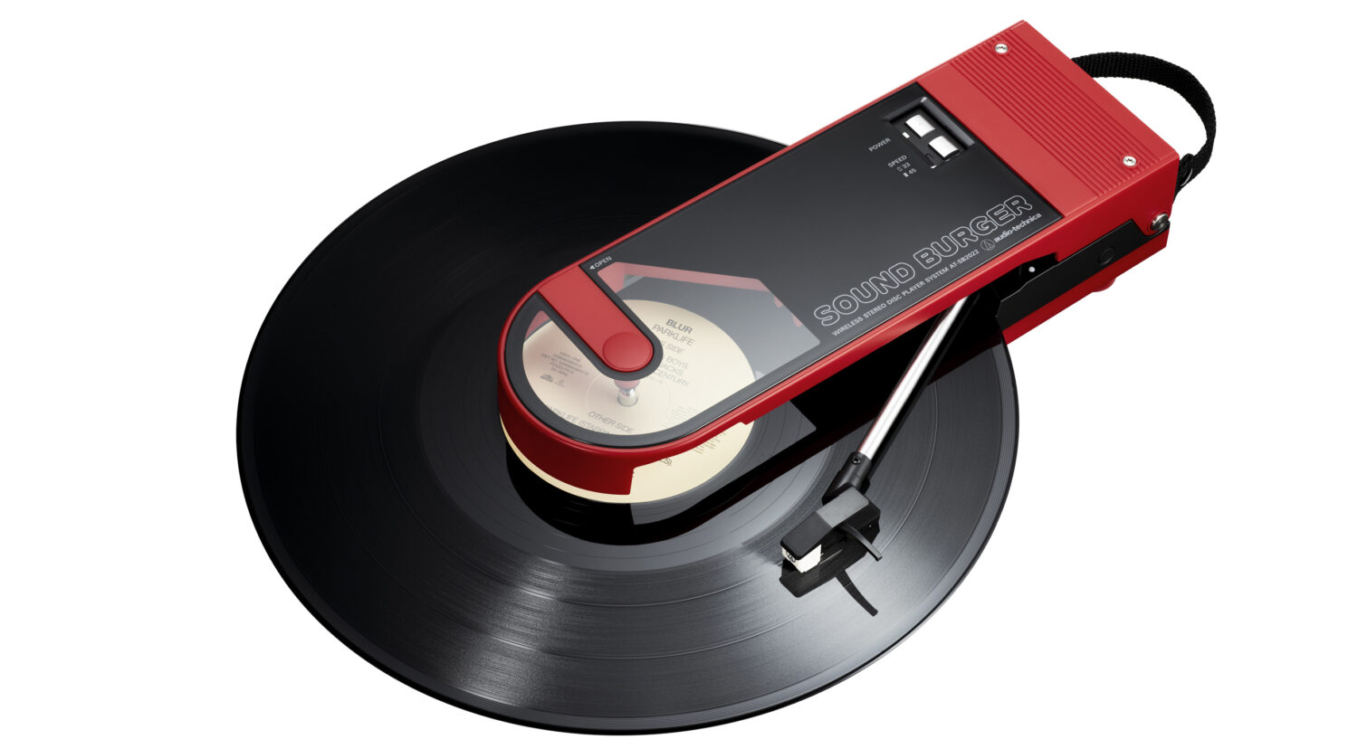 The updated Sound Burger boasts a belt-drive system that plays 33-1/3 and 45 RPM records, allowing the choice between singles and LPs. To ensure that the Sound Burger is as portable as ever, it even uses a dynamic balance system that sees pressure applied to the stylus via a spring, alongside a DC motor that keeps everything running smoothly during playback.